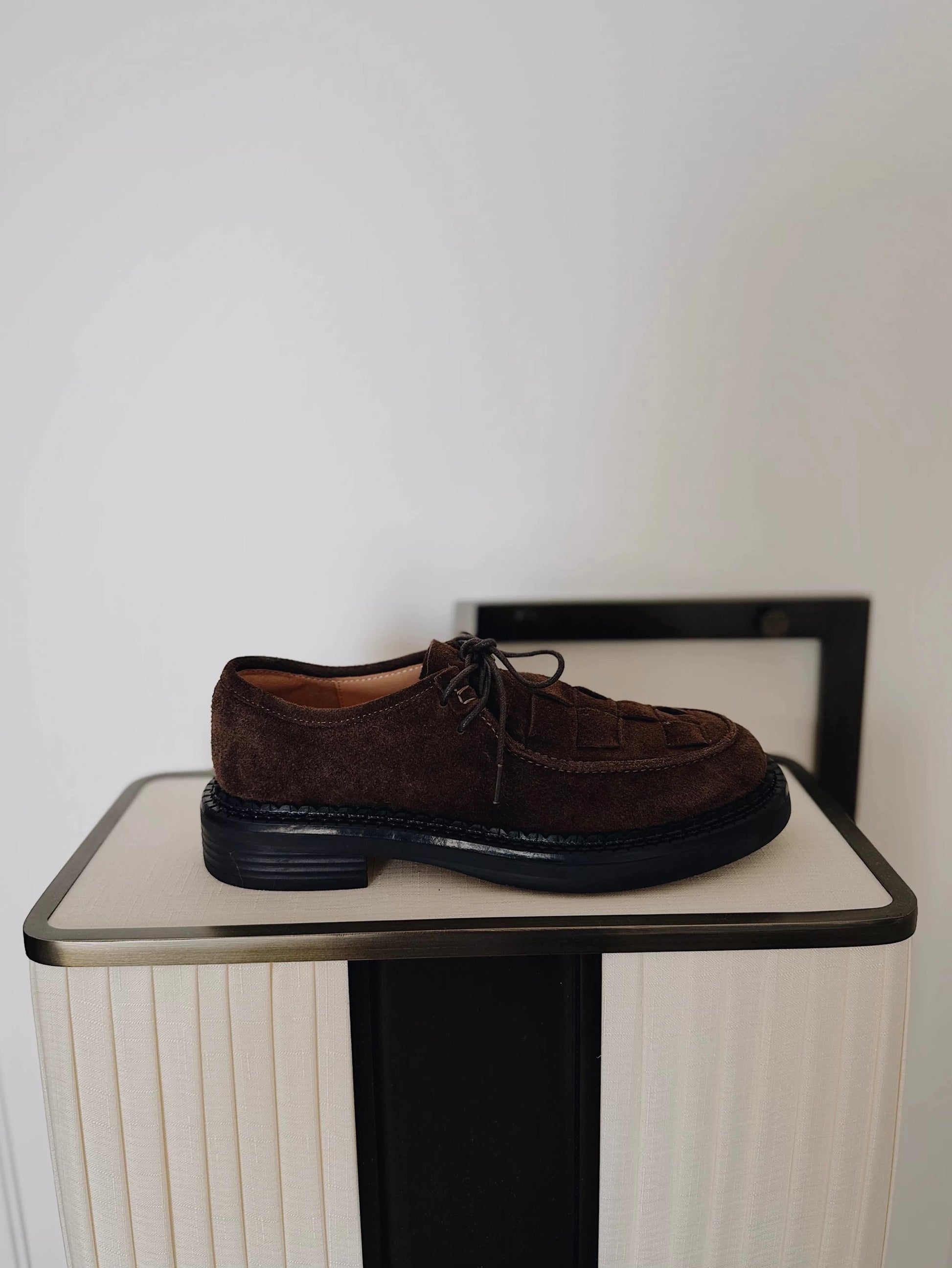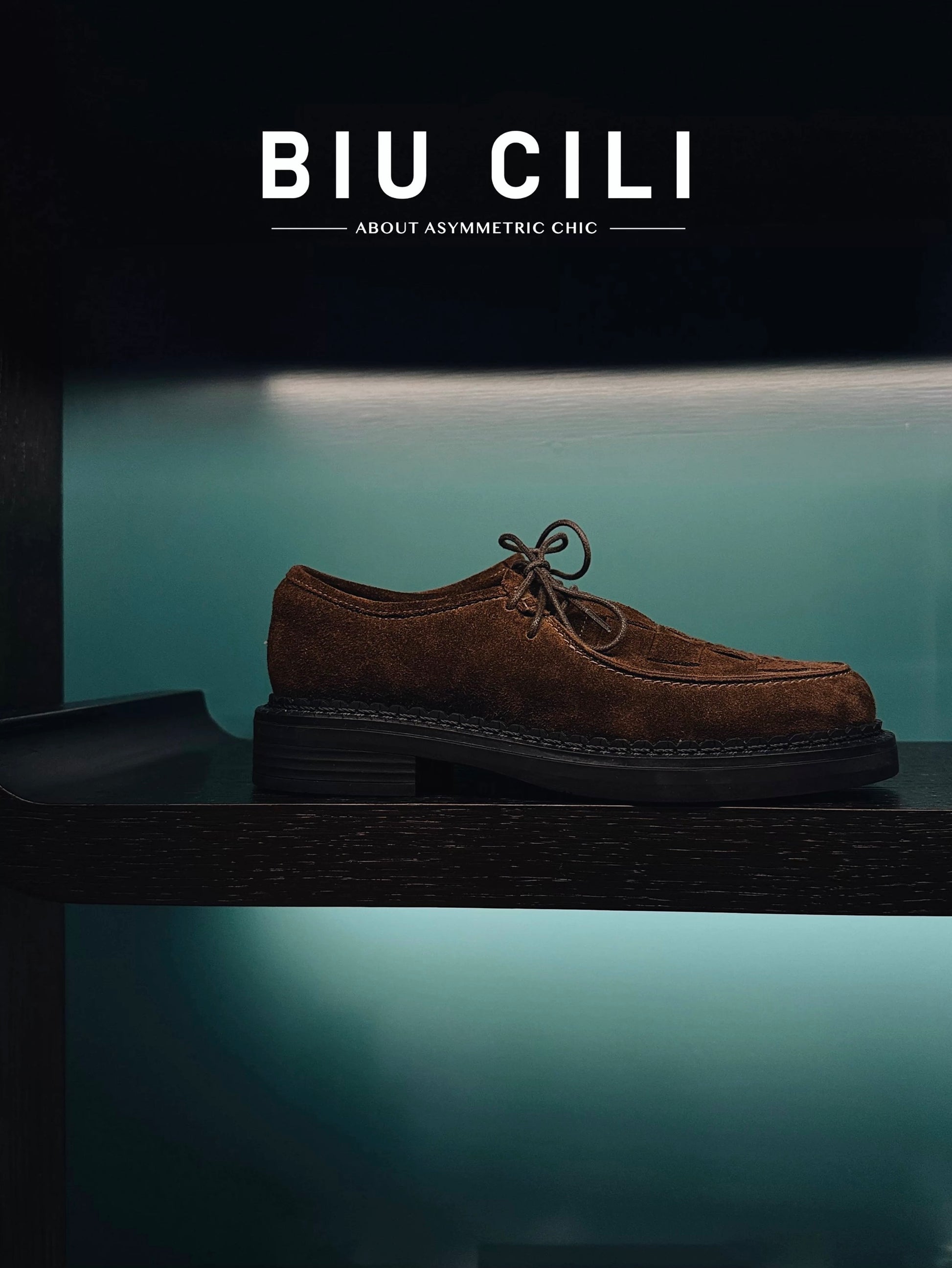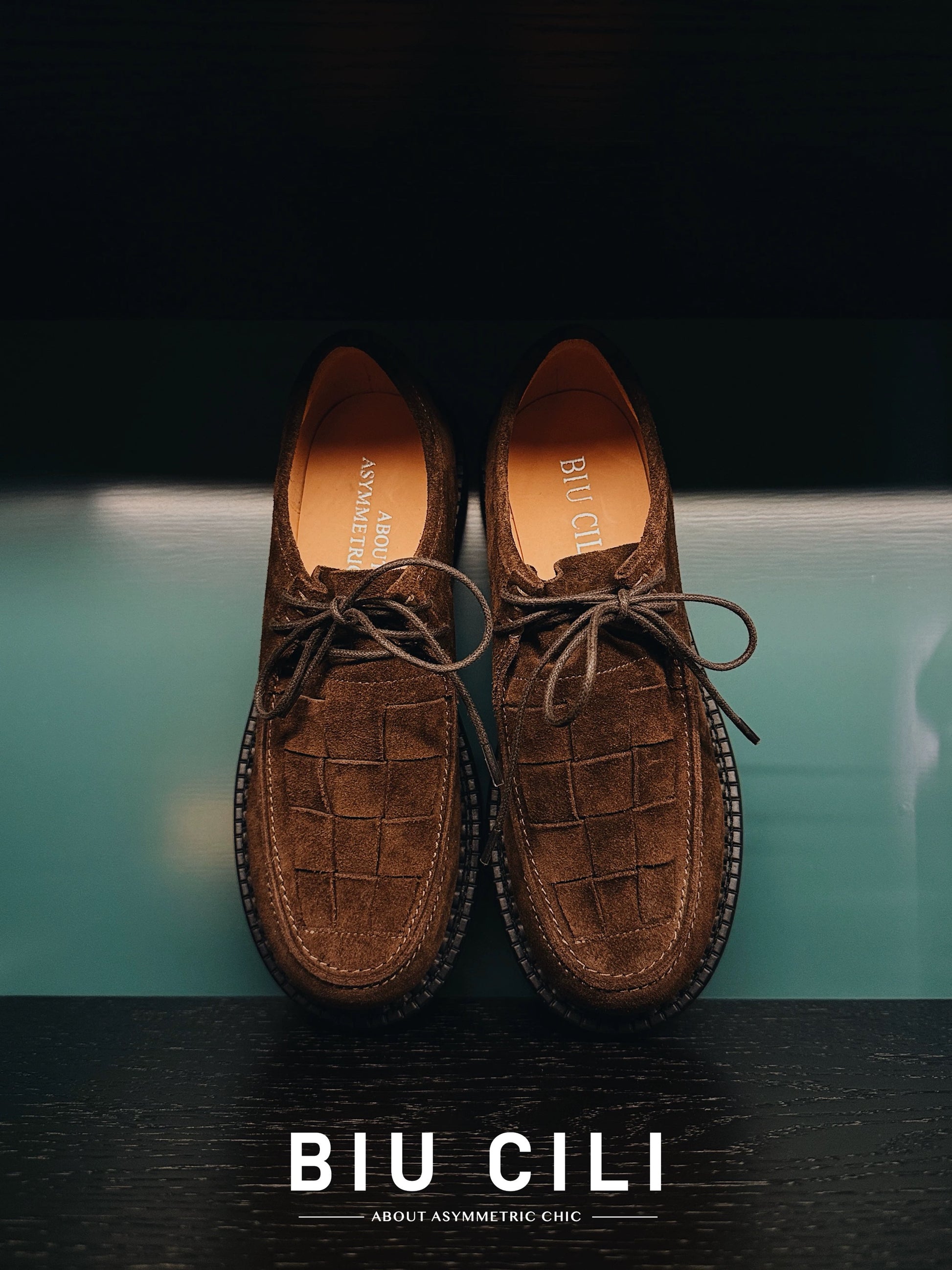 These suede derby shoes reinterpret a classic lace-up silhouette through texture and structure. Crafted with hand-woven detailing across the vamp, the design introduces depth and subtle irregularity—measured, intentional, and distinctly BIU CILI.