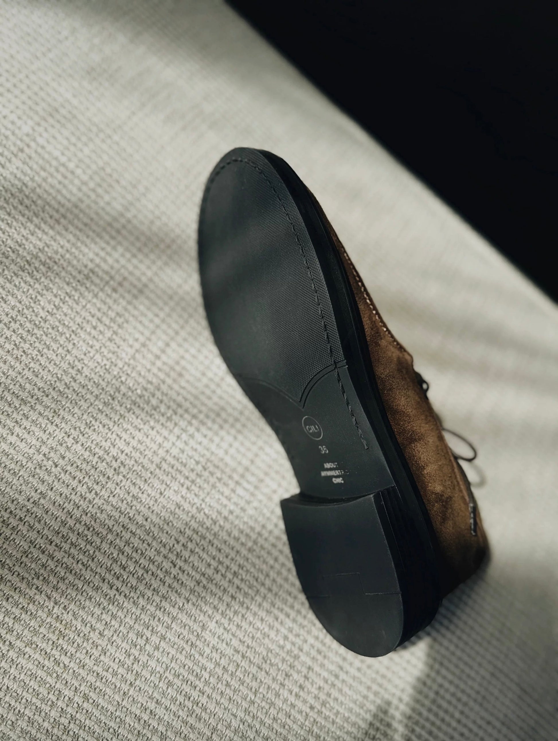 The soft suede upper contrasts with a chunky outsole that grounds the look while offering stability and everyday comfort. Clean lines and restrained proportions keep the design versatile, making it easy to style with tailored trousers, denim, or relaxed skirts. This is a pair defined not by excess, but by detail—where craftsmanship speaks quietly.