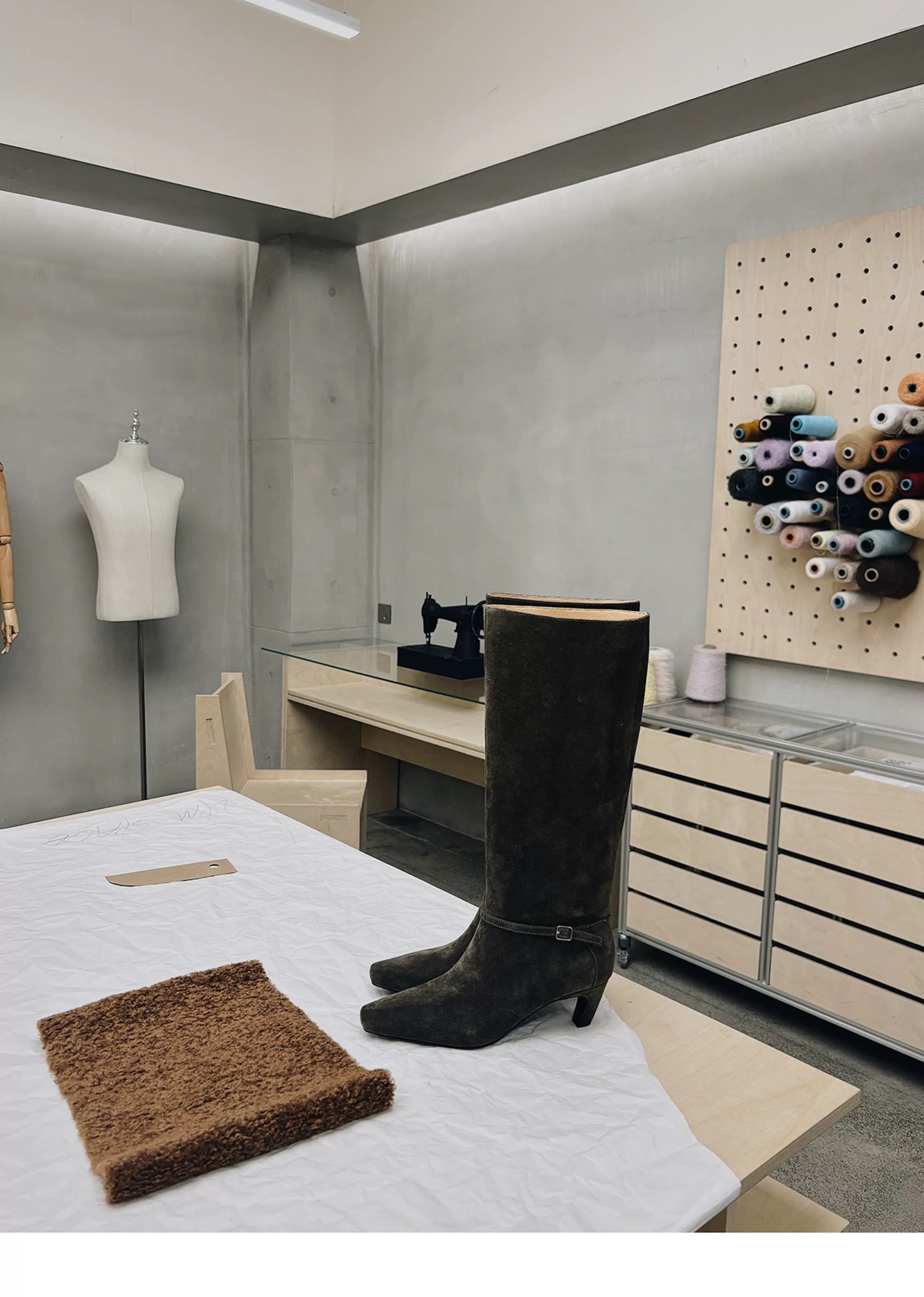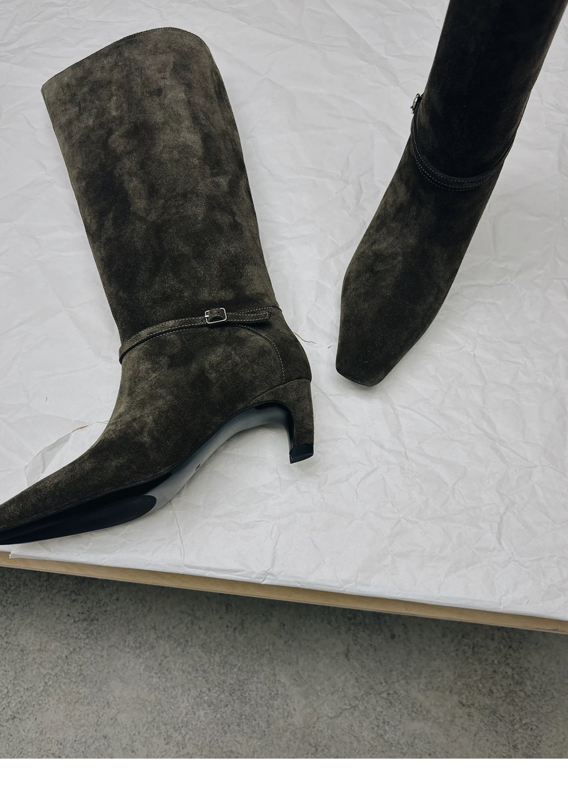 Crafted from suede in khaki/grey tones, the texture feels supple and warm, offering a muted richness ideal for autumn and winter wardrobes. Minimal hardware and discreet detailing maintain a quiet presence, allowing the proportions and material to take focus. The result is a pair that feels polished yet understated—equally suited to tailored looks and relaxed daily wear.